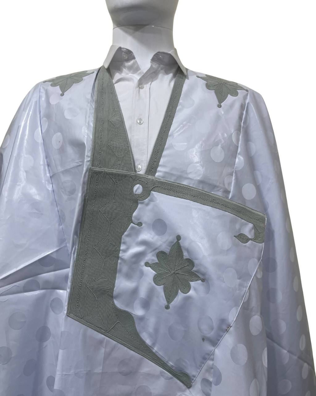 Une élégante djellaba pour homme en taille 8, accompagnée d'un pantalon, fabriquée en tissu khent azbi blanc original de haute qualité, connu pour son apparence luxueuse. Elle est cousue avec une couture de qualité, avec une touche moderne marquée tout en préservant l'authenticité.