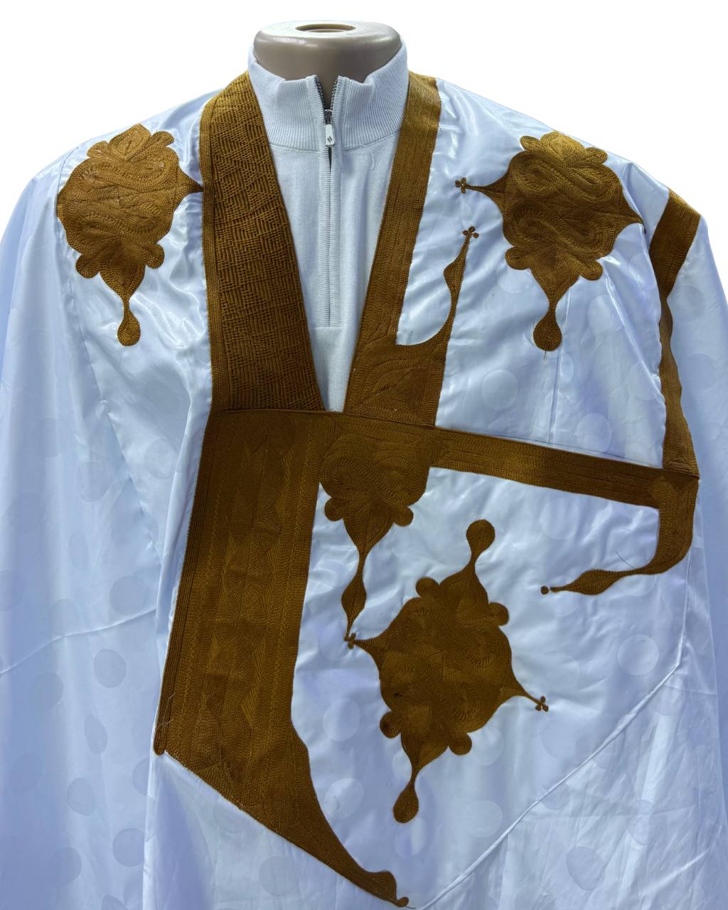 Une élégante djellaba pour homme en taille 8, accompagnée d'un pantalon, fabriquée en tissu khent azbi blanc original de haute qualité, connu pour son apparence luxueuse. Elle est cousue avec une couture de qualité, avec une touche moderne marquée tout en préservant l'authenticité.