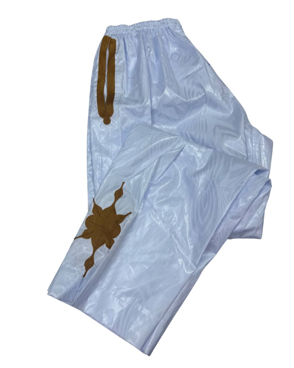دراعة رجالية أنيقة بمقاس10م مرفقة مع سروال بانتلوه ، مصنوعة من قماش خنط أزبي الابيض الأصلي عالي الجودة، المعروف بمظهره الفخم. تمت خياطتها بخياطة الداومة الكج ، بلمسة عصرية بارزة مع الحفاظ على الأصالة.