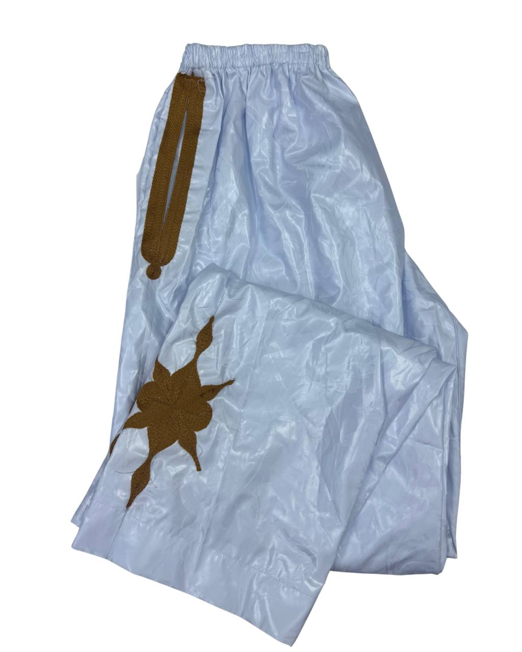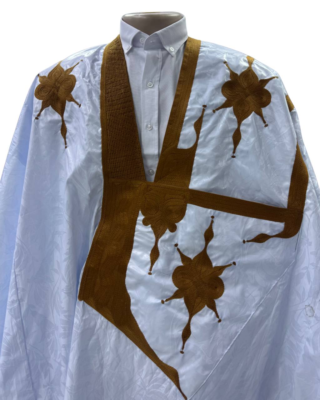 دراعة رجالية أنيقة بمقاس10م مرفقة مع سروال بانتلوه ، مصنوعة من قماش خنط أزبي الابيض الأصلي عالي الجودة، المعروف بمظهره الفخم. تمت خياطتها بخياطة الداومة الكج ، بلمسة عصرية بارزة مع الحفاظ على الأصالة.