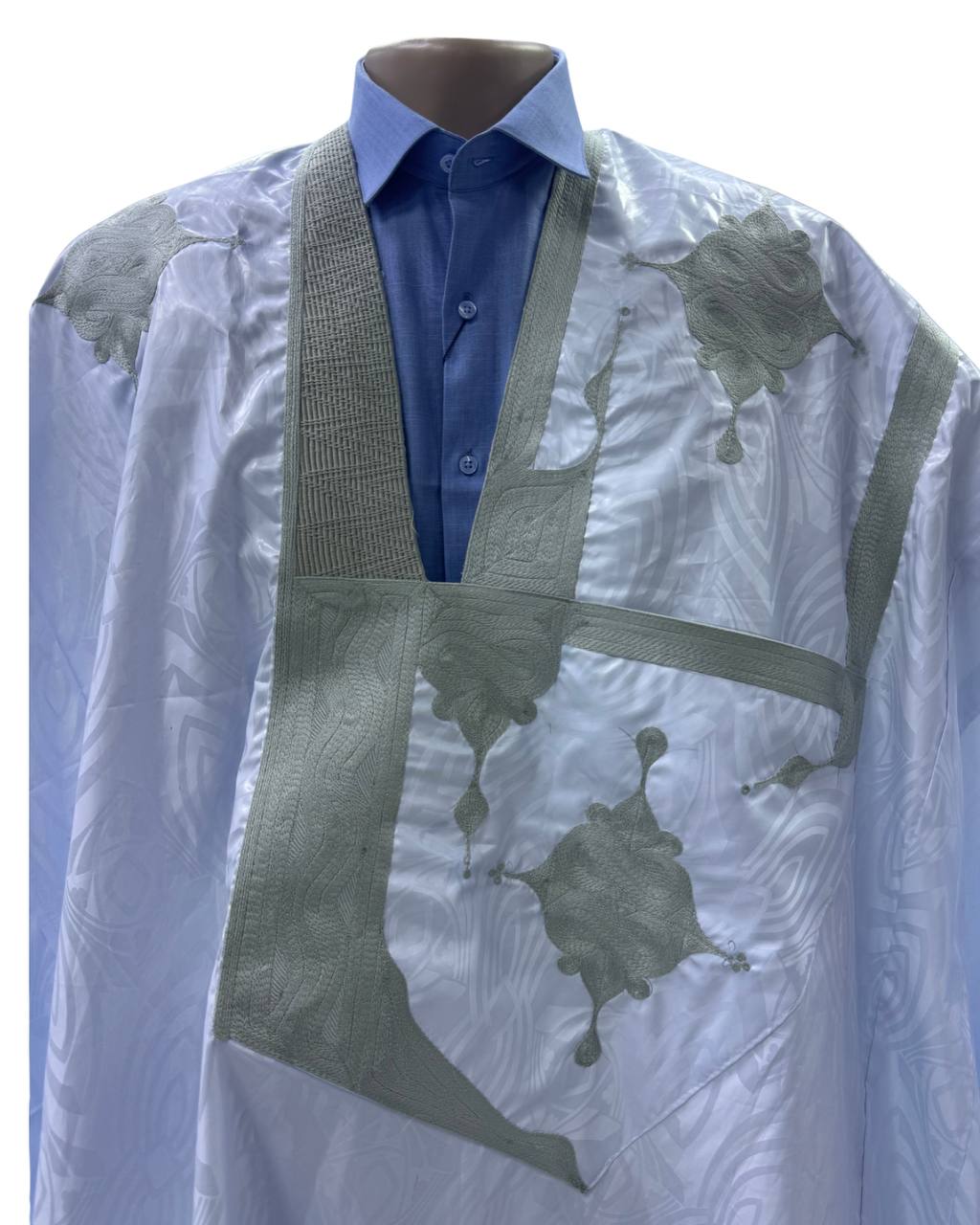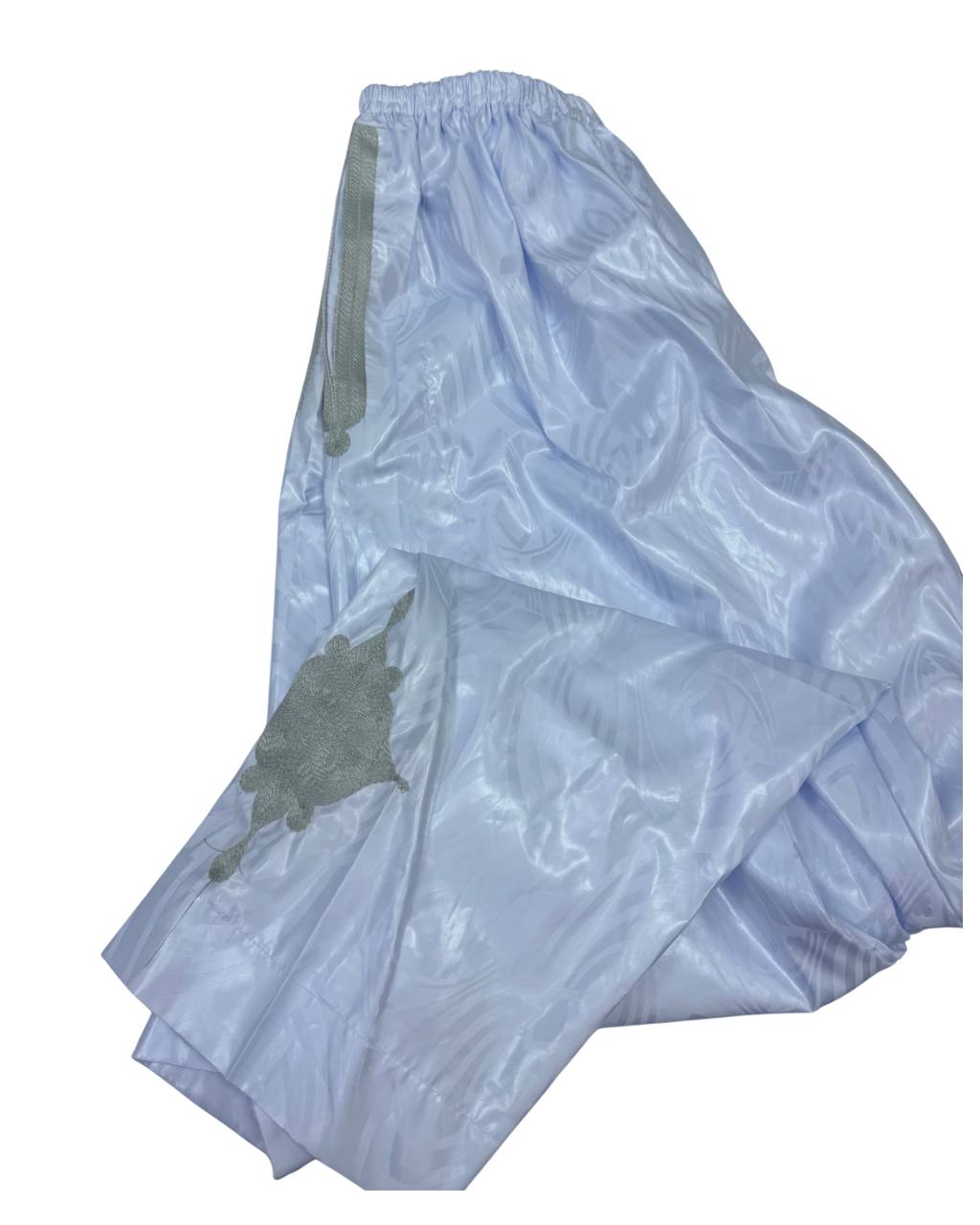 دراعة رجالية أنيقة بمقاس10م مرفقة مع سروال بانتلوه ، مصنوعة من قماش خنط أزبي الابيض الأصلي عالي الجودة، المعروف بمظهره الفخم. تمت خياطتها بخياطة الداومة الكج ، بلمسة عصرية بارزة مع الحفاظ على الأصالة.