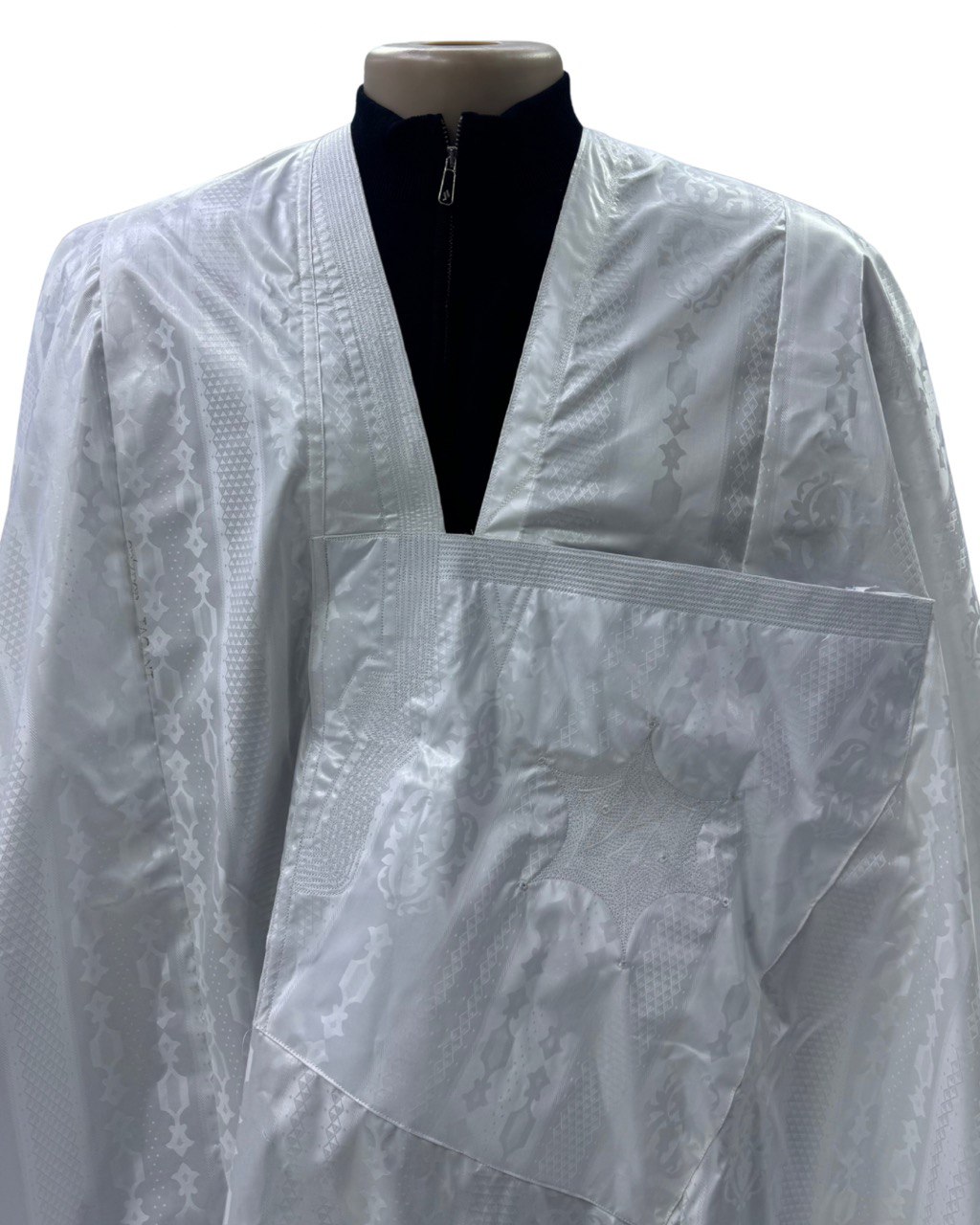دراعة رجالية أنيقة بمقاس8م مرفقة مع بانتلوه بطول 96 سم، مصنوعة من قماش خنط جزنير الأصلي عالي الجودة، المعروف بمظهره الفخم. تمت خياطتها بخياطة سيمبل ديسيه  ، بلمسة عصرية بارزة مع الحفاظ على الأصالة.