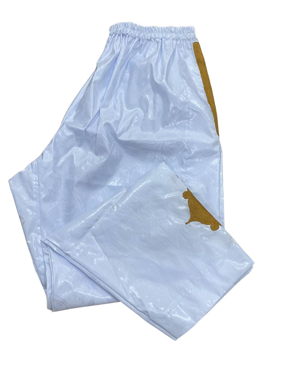 دراعة رجالية أنيقة بمقاس8م مرفقة مع بانتلوه ، مصنوعة من قماش خنط أزبي الابيض الأصلي عالي الجودة، المعروف بمظهره الفخم. تمت خياطتها بخياطة الداومة الكج ، بلمسة عصرية بارزة مع الحفاظ على الأصالة.